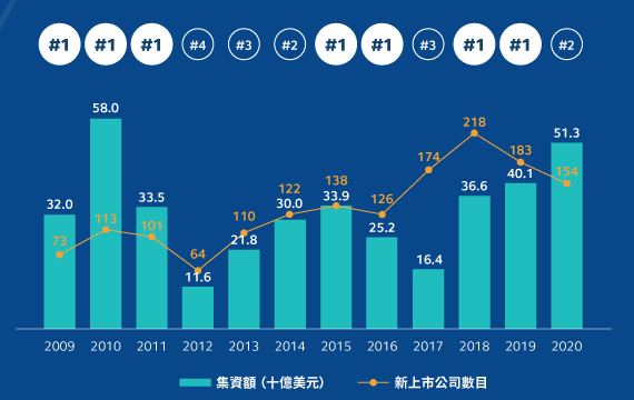 2020年盡管環(huán)球市場波動異常,但是港交所的一級市場仍領(lǐng)先全球IPO集資榜,共有154家公司在香港交易所上市,2020年首次公開招股集資額位列全球第二,集資金額達3,975億港元,是2010年以來最高,這主要得益于內(nèi)地紛紛赴港企業(yè)上市。