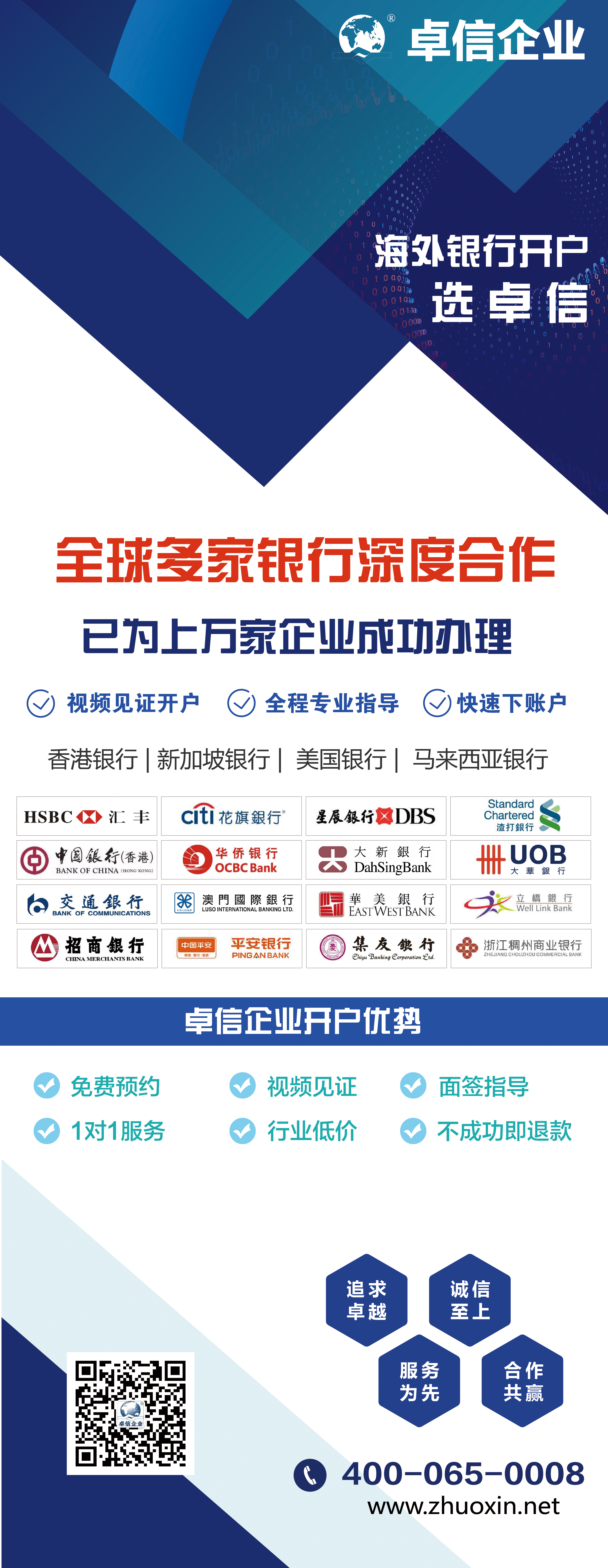 卓信擁有多年開戶經(jīng)驗,與多家銀行有良好合作關(guān)系,為客戶提供免費開戶預(yù)約服務(wù),國內(nèi)視頻見證開戶,全程保駕護航,歡迎隨時聯(lián)系!