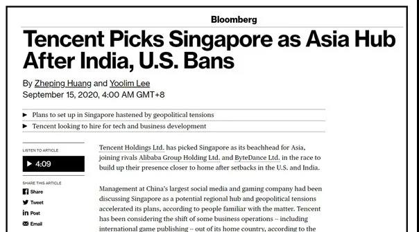9月15日,繼阿里巴巴、字節(jié)跳動(dòng)之后,騰訊集團(tuán)也選擇將進(jìn)軍亞洲其他地區(qū)的橋頭堡設(shè)立在新加坡。