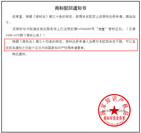 根據(jù)《商標(biāo)法》第三十四條的規(guī)定,商標(biāo)注冊申請人如果對本駁回決定不服,可以自收到本通知之日起十五日內(nèi)向國家知識產(chǎn)權(quán)局申請復(fù)審。